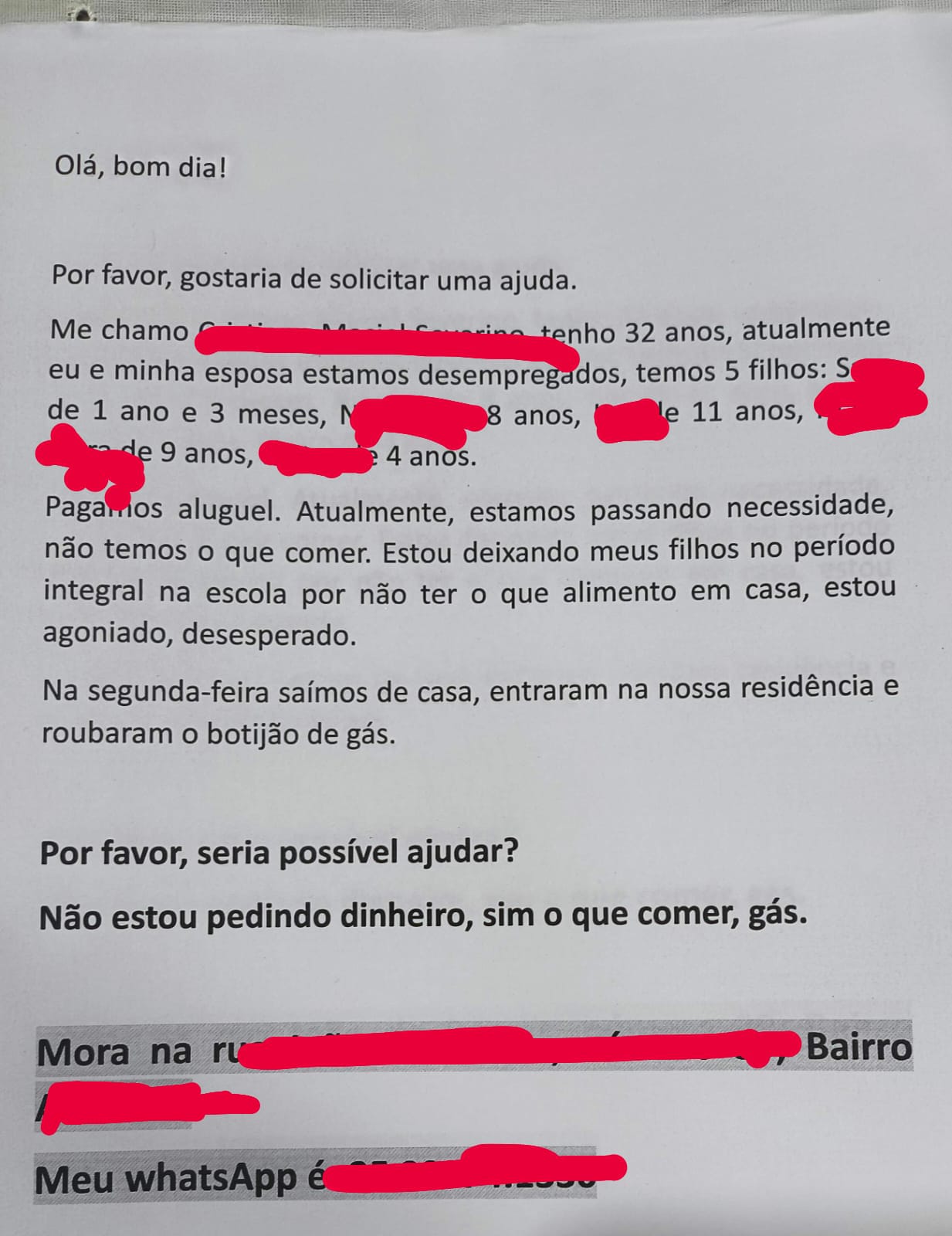 Cesta básica, o Cezar e a Bete já levaram, porém estamos precisando de um botijão (vasilhame) e o gás pra essa família.