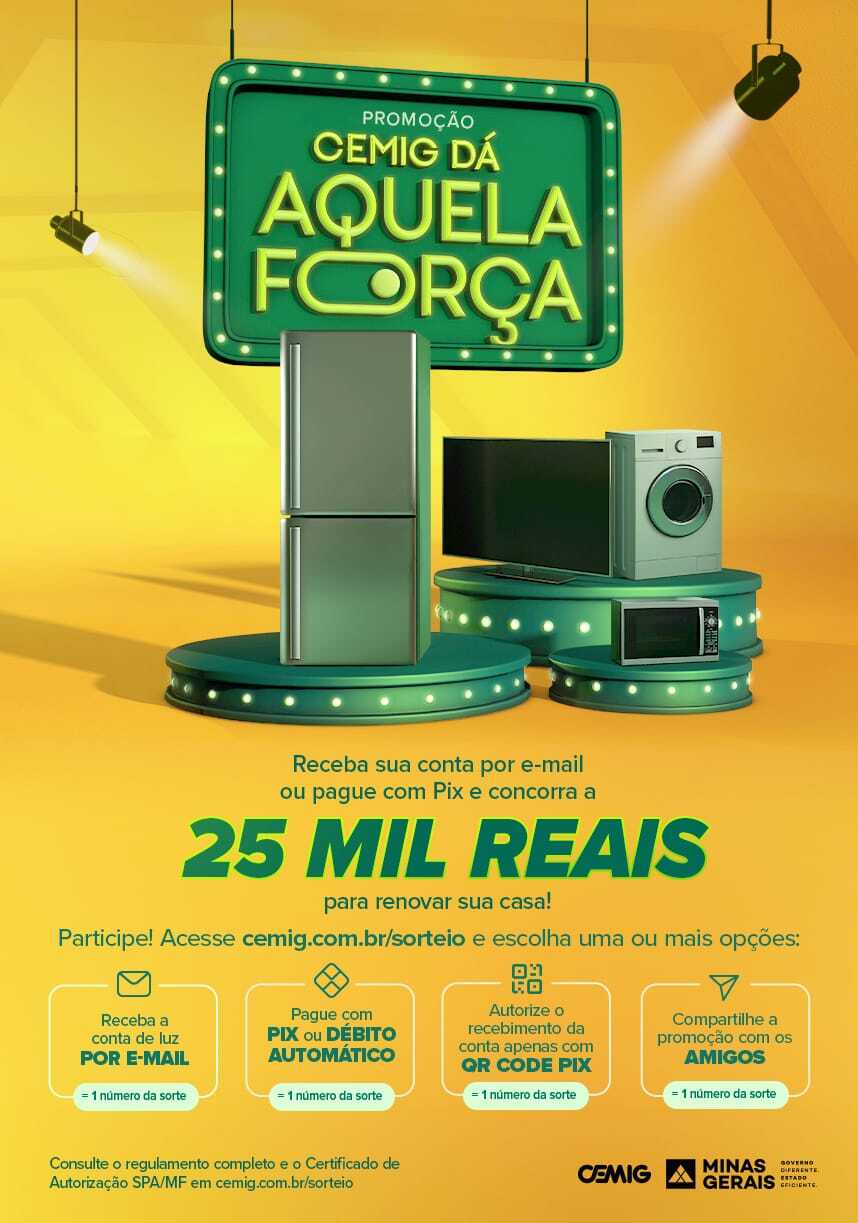 Já imaginou renovar sua casa por conta da Cemig? A promoção “Cemig Dá Aquela Força” irá premiar dois clientes da companhia, de qualquer lugar do estado, com prêmios de R$ 25 mil. Trata-se de um incentivo para que o consumidor possa utilizar as formas digitais de pagamento e atendimento oferecidas pela empresa. Aderindo aos critérios estabelecidos no regulamento da promoção, os clientes participam de dois sorteios e passam a utilizar as formas mais cômodas, modernas e seguras de quitação de contas e de atendimento.