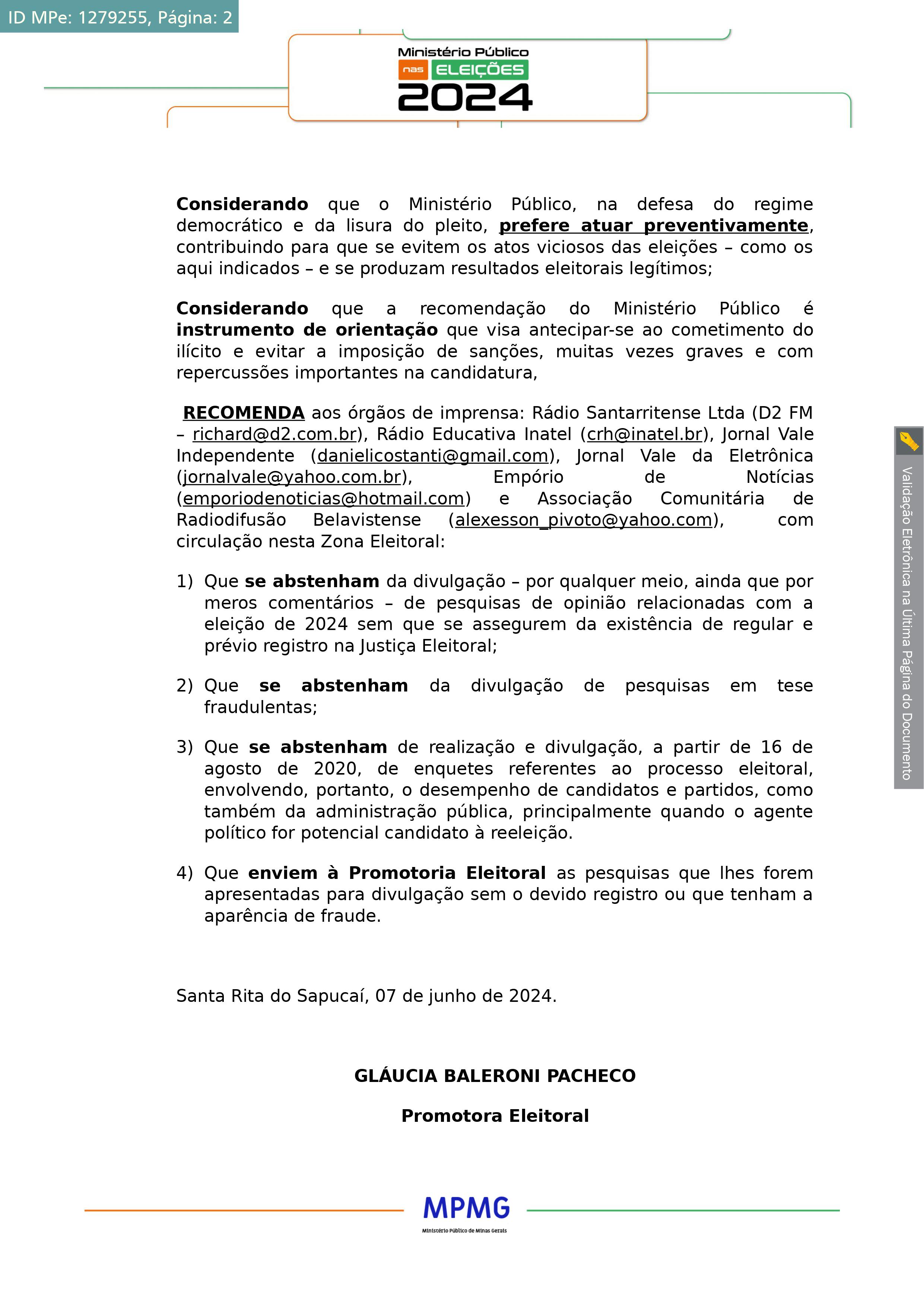 RECOMENDAÇÕES – PROMOTORIA ELEITORAL DE SANTA RITA DO SAPUCAÍ