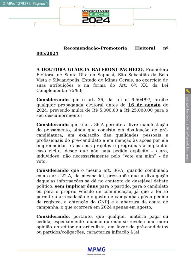 RECOMENDAÇÕES – PROMOTORIA ELEITORAL DE SANTA RITA DO SAPUCAÍ