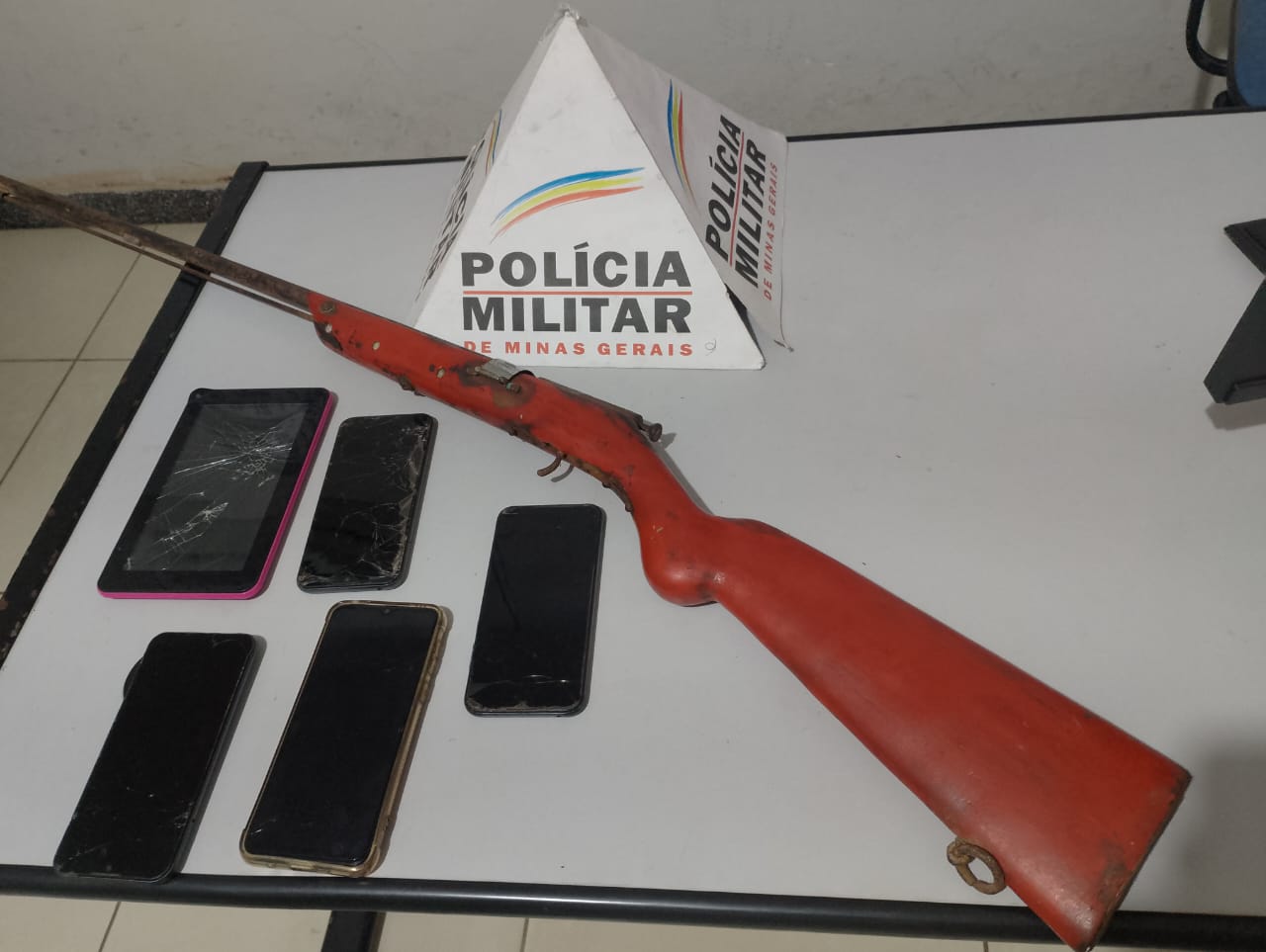 A Polícia Militar deslocou até a residência denunciada e após buscas, foi encontrada uma Espingarda Polveira em um quarto. Também foi recolhido diversos celulares, que não possuíam nota fiscal.