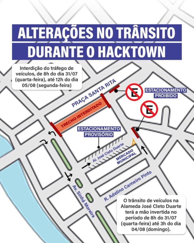 🔹A mão de circulação da Alameda José Cleto Duarte será invertida, sendo permitida somente a circulação no sentido da Av. Sinhá Moreira até a Av. Antônio Paulino, com obrigatoriedade de conversão à esquerda, sentido Praça Santa Rita.