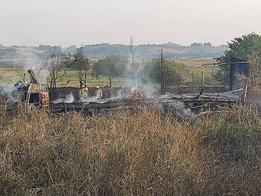 Carreta sai da pista e pega fogo na Fernão Dias em Careaçu