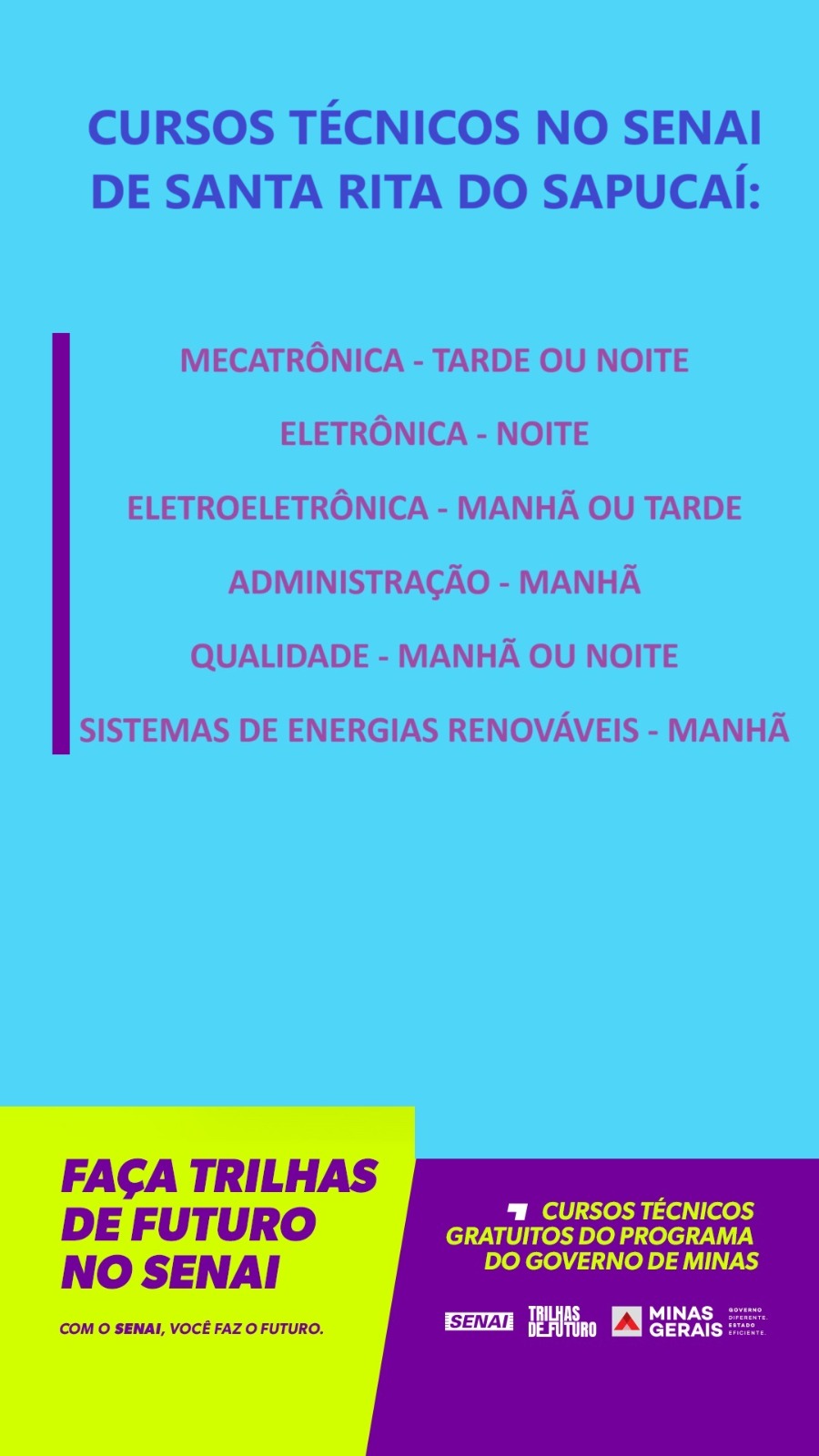 • Manhã (8h às 12h): Eletroeletrônica, Administração, Qualidade, Sistemas de Energia Renovável