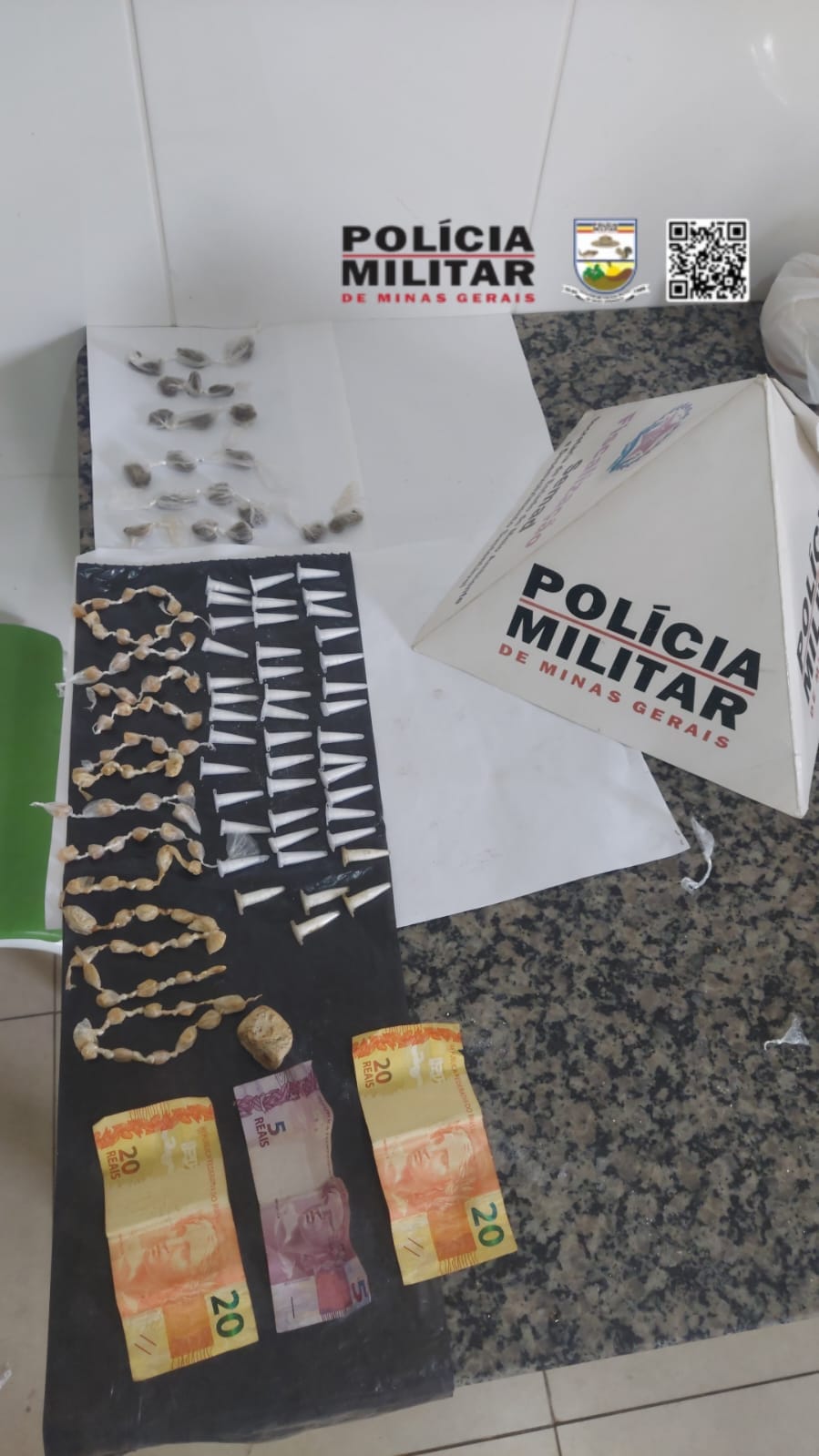 Foram apreendidas 36 pedras análogas a Crack, 05 pinos com substância análoga à cocaína, 41 pedras de Crack, 38 pinos de cocaína e 20 buchas de maconha.