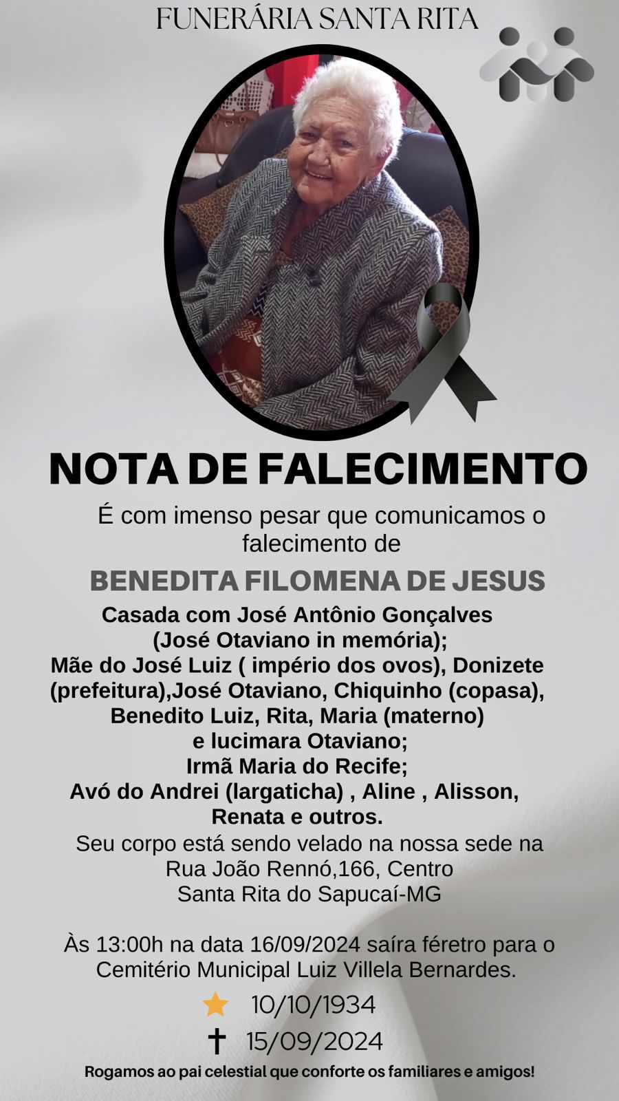 A imagem da nota é fornecida pela Funerária Santa Rita.
