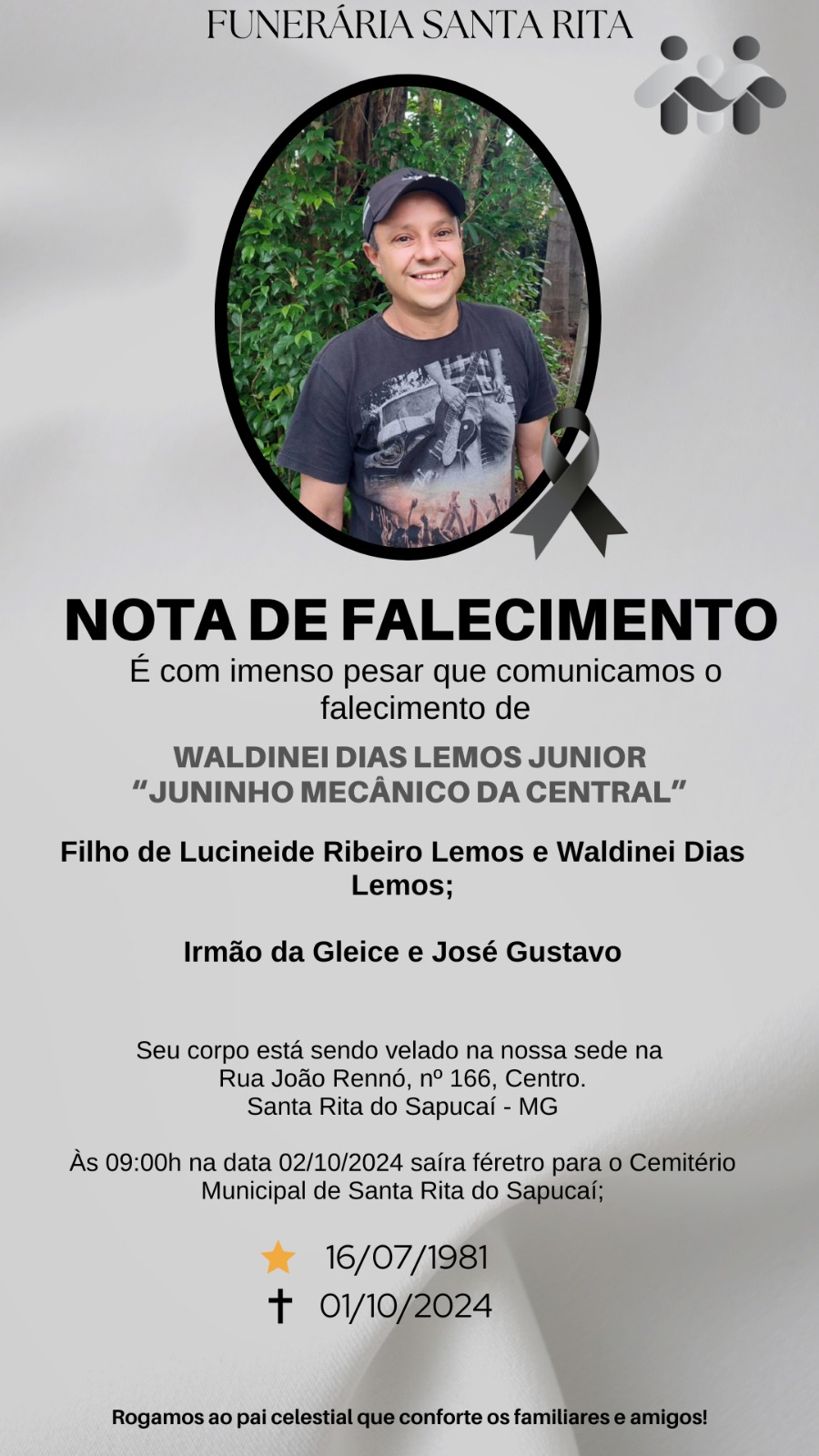 A imagem da nota é fornecida pela Funerária Santa Rita.