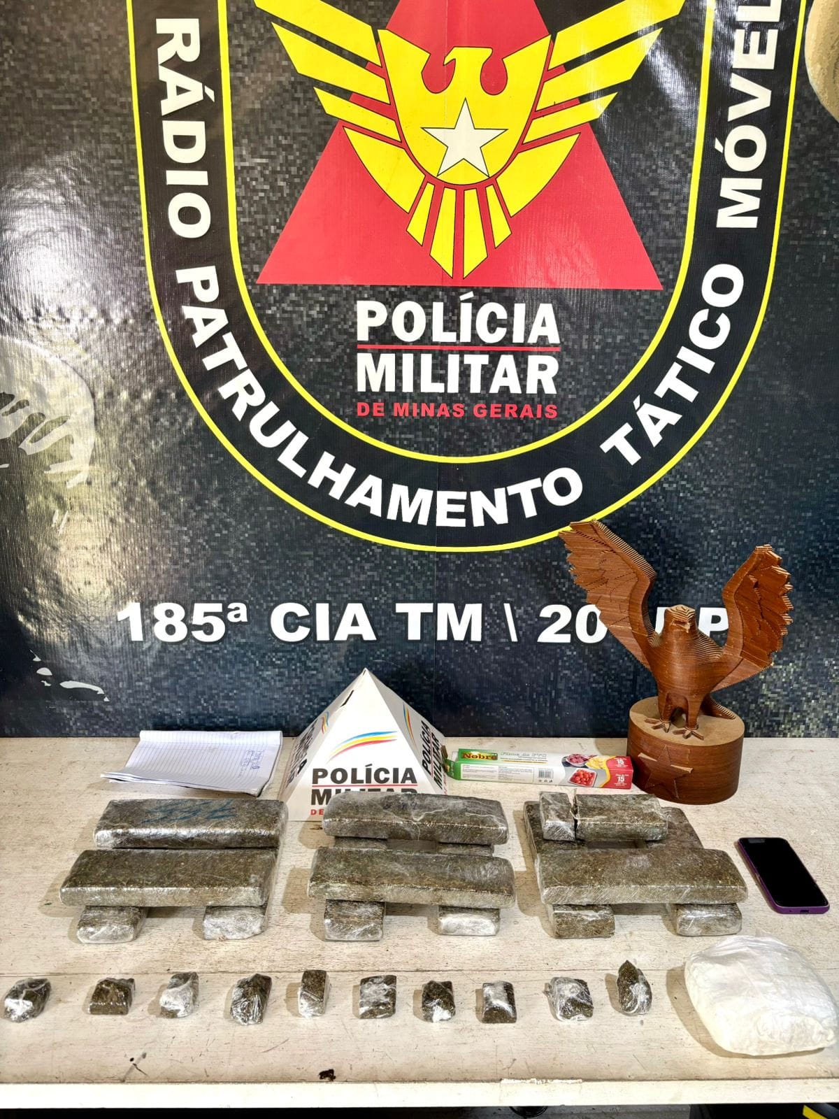 No local, foram encontrados 12 quilos de maconha, 10 porções da mesma droga, uma porção de cocaína e um celular.