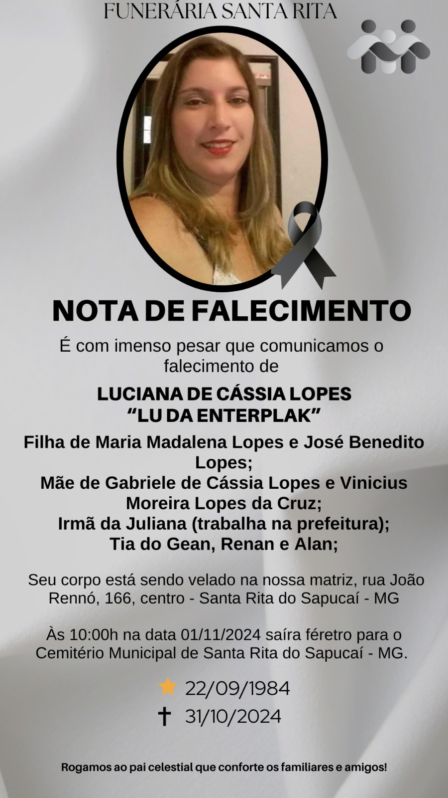 A imagem da nota é fornecida pela Funerária Santa Rita.