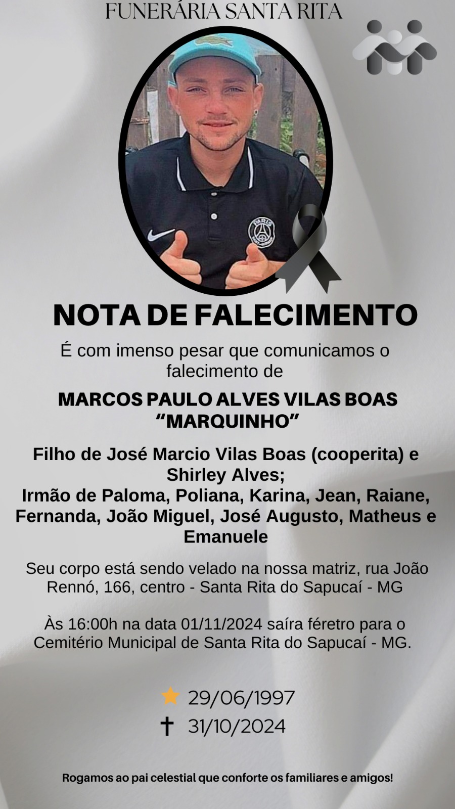 A imagem da nota é fornecida pela Funerária Santa Rita.