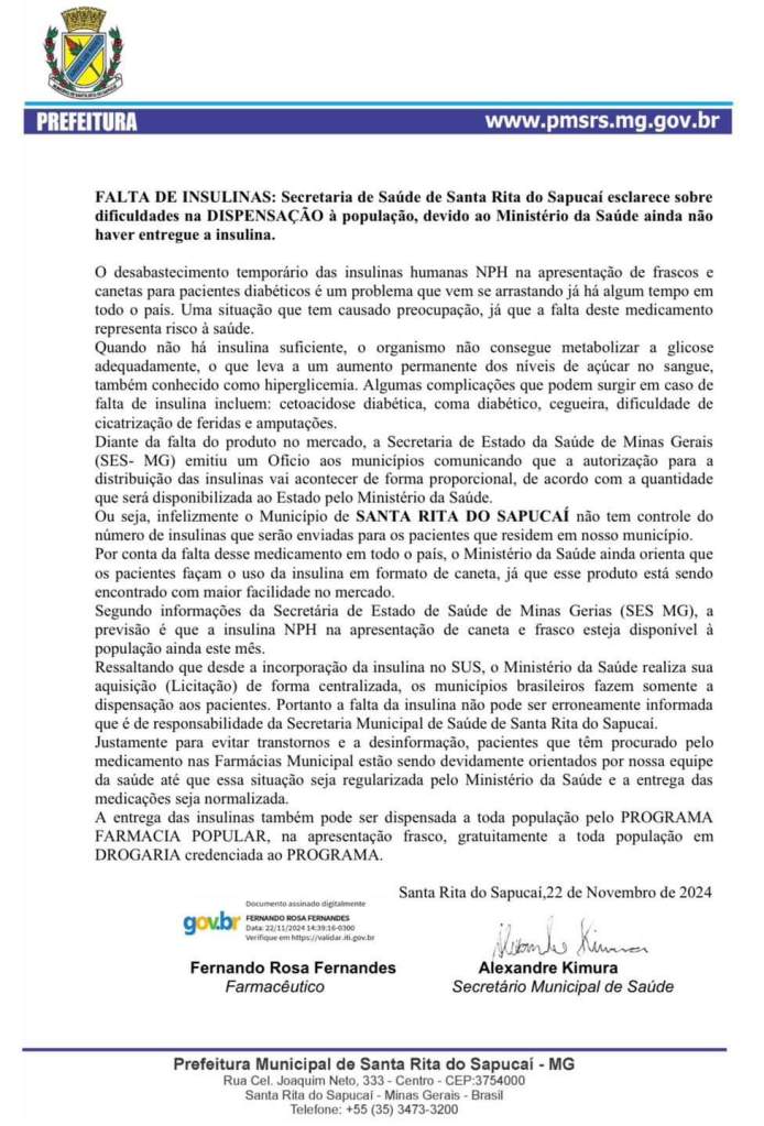 Secretaria de Saúde da Santa Rita esclarece sobre dificuldades na dispensação à população, devido ao Ministério da Saúde ainda não haver entregue a insulina
