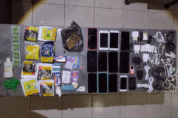 A mochila continha 15 celulares, três fones de ouvido, 13 cabos de carregadores, 10 fontes de celular, 9 chips de celular, 8 pacotes de fumo, 1 invólucro com 36 gramas de maconha, 26 cápsulas vazias de cocaína e cola epóxi.