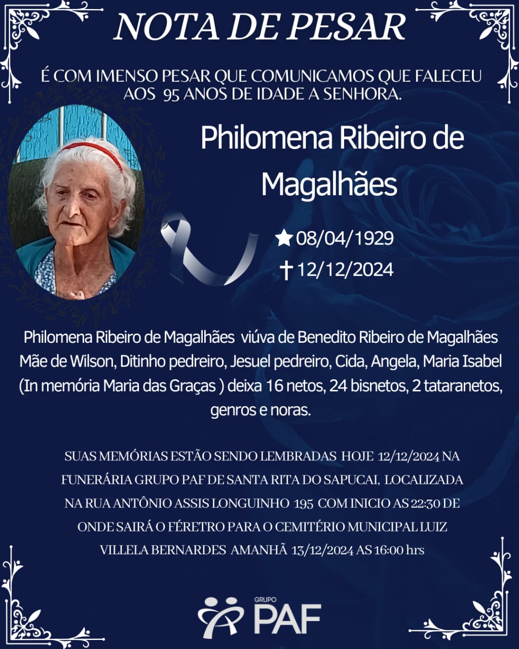 NOTA DE FALECIMENTO – Philomena Ribeiro de Magalhães