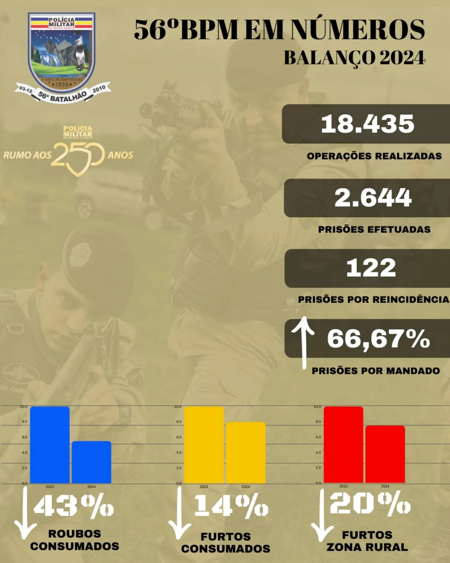 O 56° BPM atuou em 2024 na diminuição de roubos, furtos e furtos em zona rural de Itajubá e região.