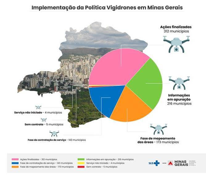 O Governo de Minas destinou R$ 30 milhões para contratação e execução do geomonitoramento por drones. Nos municípios com menos de 30 mil habitantes, os recursos foram repassados aos Consórcios Intermunicipais de Saúde, que gerenciam o serviço.