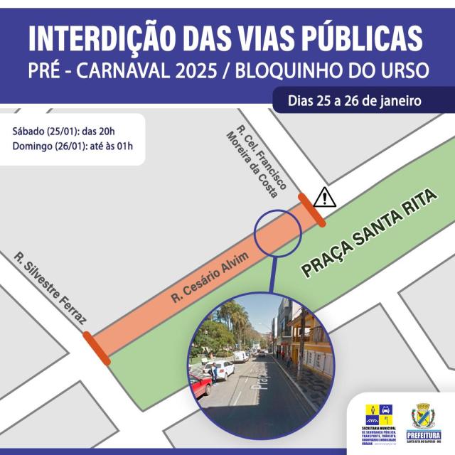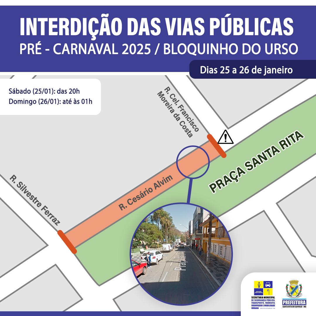 Em virtude da realização do Bloquinho do Urso, haverá interdição da Praça Santa Rita no trecho indicado no mapa: