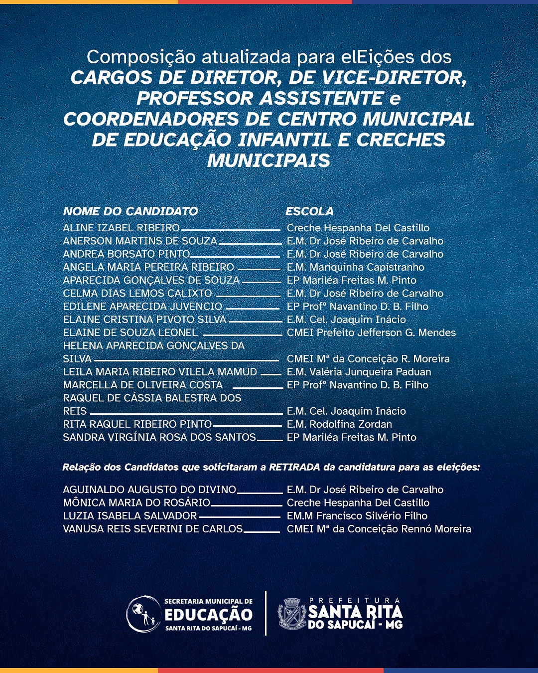A Prefeitura de Santa Rita do Sapucaí divulga a composição atualizada para as eleições dos cargos de diretor, vice-diretor, professor assistente e coordenadores dos Centros Municipais de Educação Infantil e Creches Municipais.