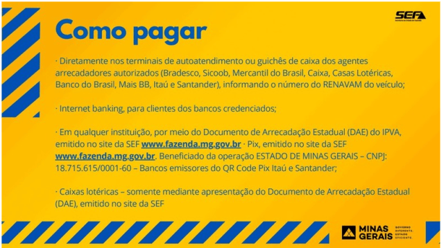 O diretor de Informações Econômico-Fiscais da SEF/MG, Ricardo Alves de Sousa, lembra que o pagamento pode ser efetuado normalmente, a qualquer momento. A ressalva, conforme explica o diretor, fica por conta do desconto da cota única, que não pode mais ser aplicado.