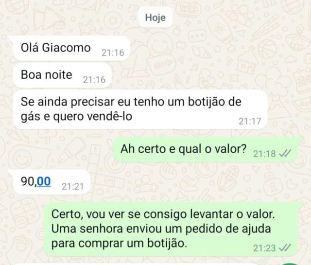 Para conseguir comprar o botijão, precisamos levar $ 90,00. Quem puder nos ajudar com qualquer valor será de grande valia.