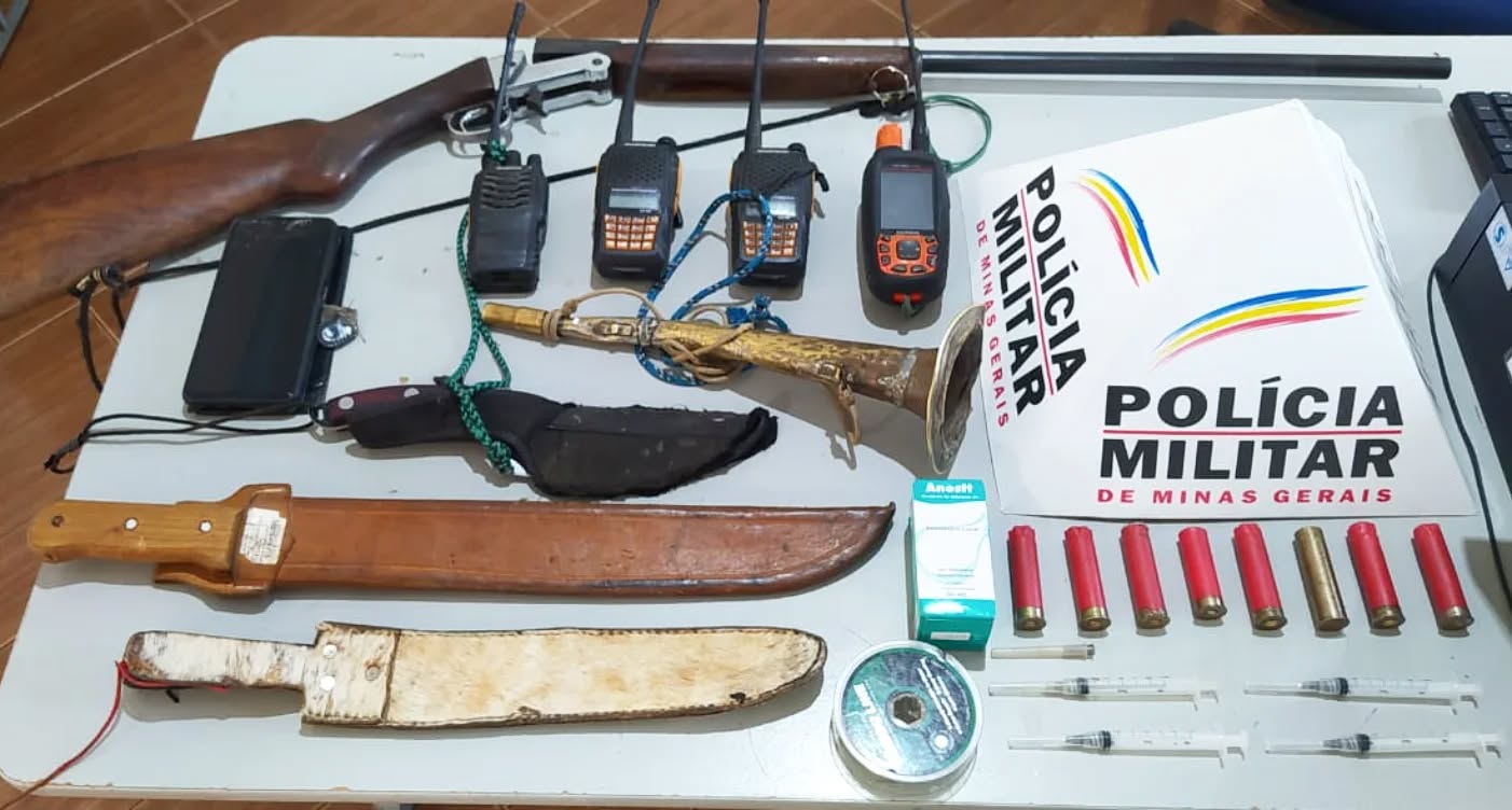 O condutor, de 69 anos, foi abordado e na busca no interior do veículo, a PM localizou: uma arma longa tipo cartucheira de marca beretta, calibre. 24; oito cartuchos intactos de calibre. 24; uma buzina para chamar cachorro; um facão; duas facas; uma caixa de medicamento anestt cloridrato de lidocaína 2%; quatro seringas completas com agulha e uma agulha separada; três rádios comunicadores e um aparelho de GPS que foram apreendidos.