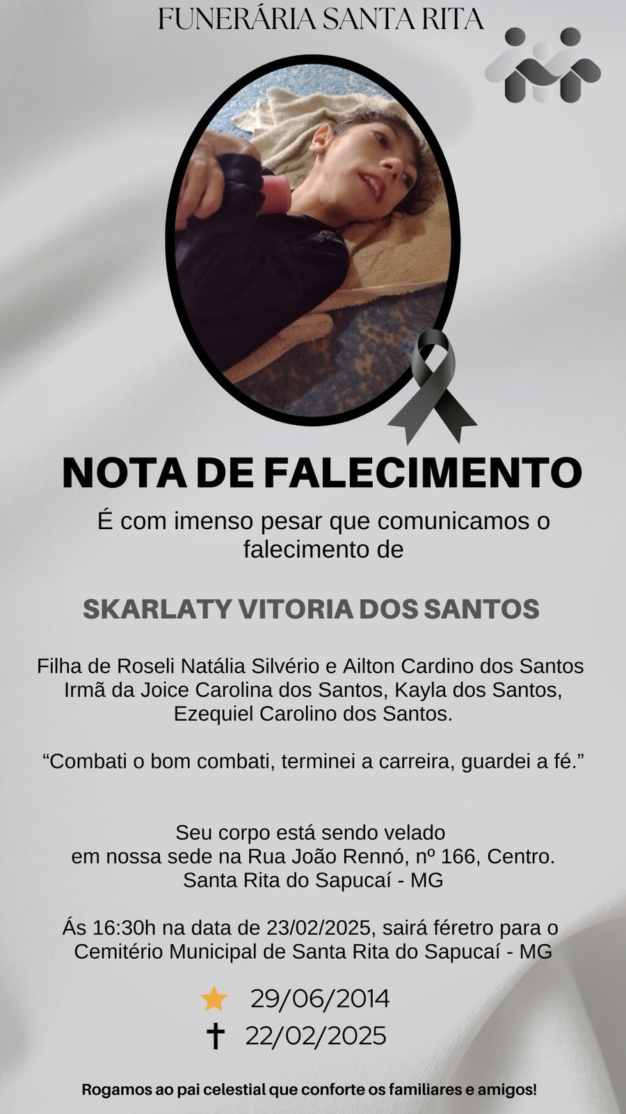 NOTA DE FALECIMENTO – Skarlaty Vitoria dos Santos