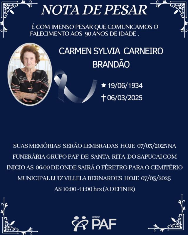 Foi com pesar que recebemos a notícia do falecimento de Carmen Sylvia Carneiro Brandão.