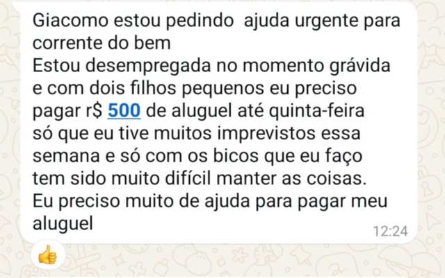 A Corrente do Bem recebeu esse pedido de ajuda, é de uma senhora grávida, com filhos pequenos e não está tendo condições de pagar o seu aluguel.