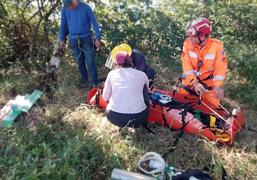 Os bombeiros subiram até o cume da pedra, onde dois escaladores já prestavam auxílio à vítima. Foi montado um sistema de resgate com cordas e técnicas verticais de salvamento para retirar a escaldadora do local. A mulher foi imobilizada em uma prancha longa e colocada em uma maca para ser içada do local da queda até o topo da pedra.