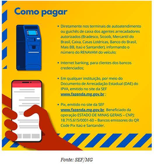 Para pagar o imposto, basta acessar o site da Secretaria de Estado de Fazenda de Minas Gerais (SEF/MG) (www.fazenda.mg.gov.br), na área do IPVA, e digitar o número do Renavam do veículo para gerar a guia de arrecadação ou o código do Pix.