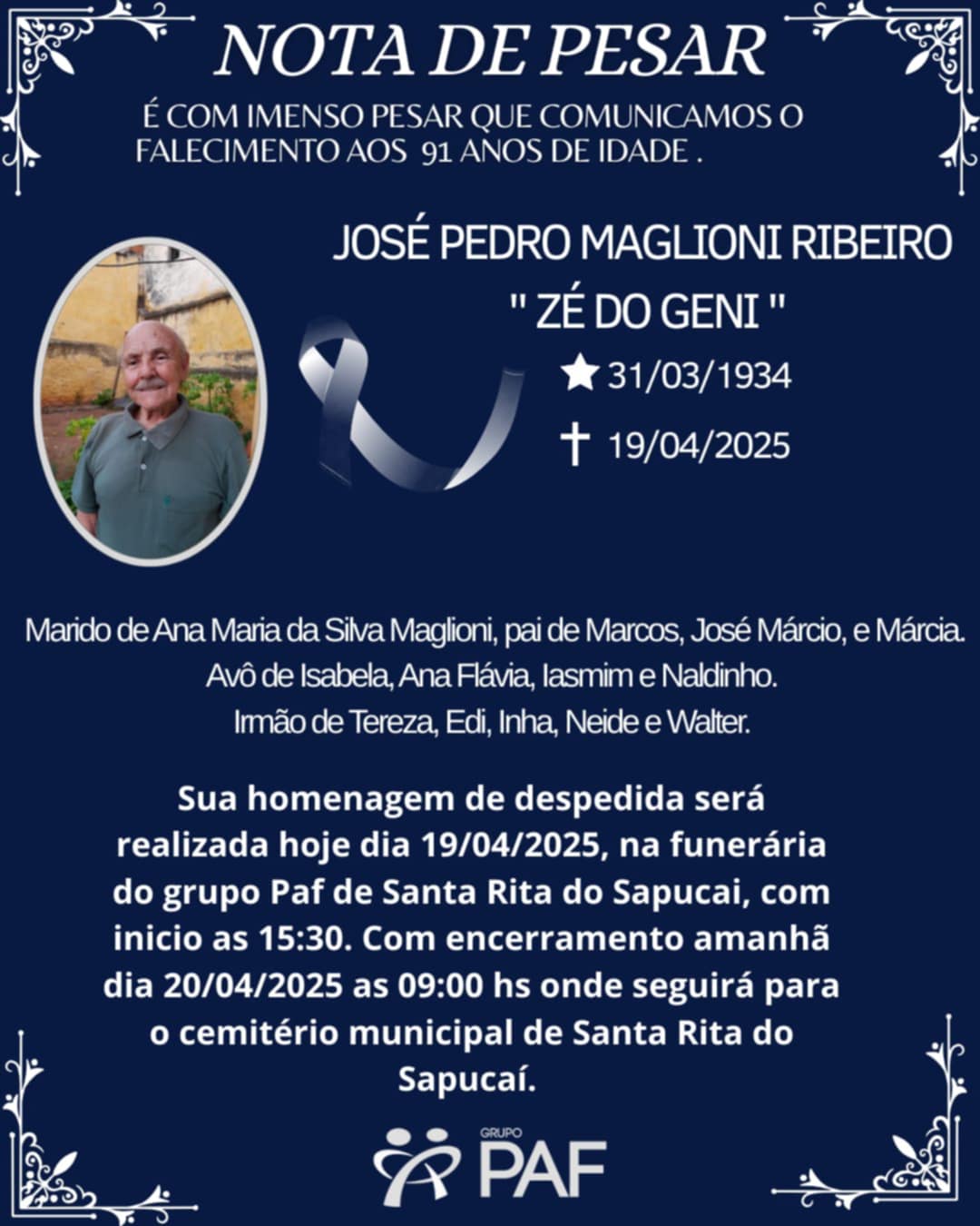 NOTA DE FALECIMENTO – José Pedro Maglioni Ribeiro