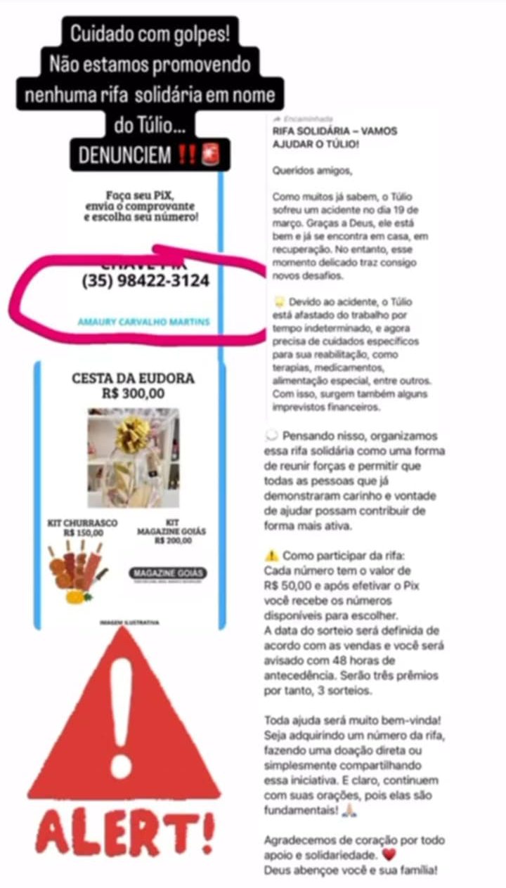 Não sabemos se é golpe ou se é outro Túlio, por isso estamos alertando o fato… Túlio graças a Deus está se recuperando muito bem e recebendo todos os cuidados necessários pra sua pronta recuperação… Continuemos nossas orações pra que ele recupere totalmente em breve…🙏🏻🙏🏻🙏🏻