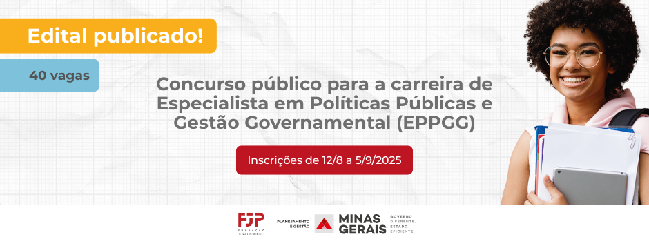 A Fundação João Pinheiro (FJP) e a Secretaria de Estado de Planejamento e Gestão de Minas Gerais (Seplag-MG) publicam nesta sexta-feira (13/6), o edital nº 005/2025, que dispõe sobre o concurso público para preenchimento de 40 vagas da carreira de Especialista em Políticas Públicas e Gestão Governamental (EPPGG).