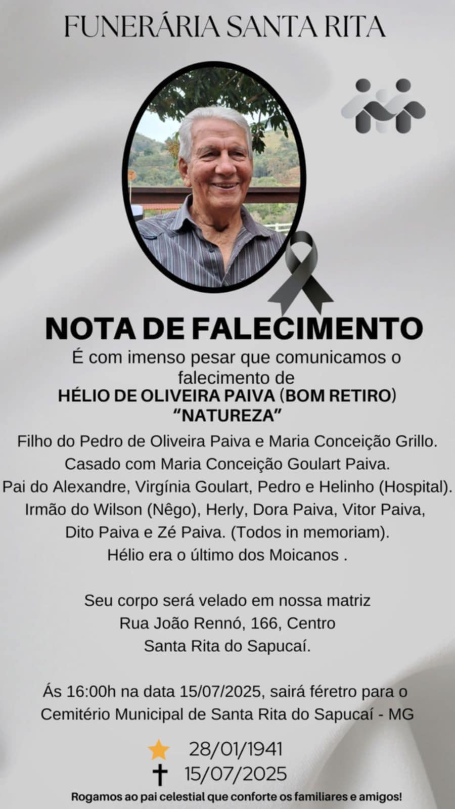 A imagem da nota é fornecida pela Funerária Santa Rita.