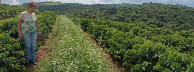 O marido, o filho e três funcionários auxiliam a produtora a cuidar dos 50 hectares de lavoura. A comercialização do café torrado e do especial é realizada para cooperativas e parceiros. A família ainda investe no turismo rural, recebendo visitantes para um café da manhã.