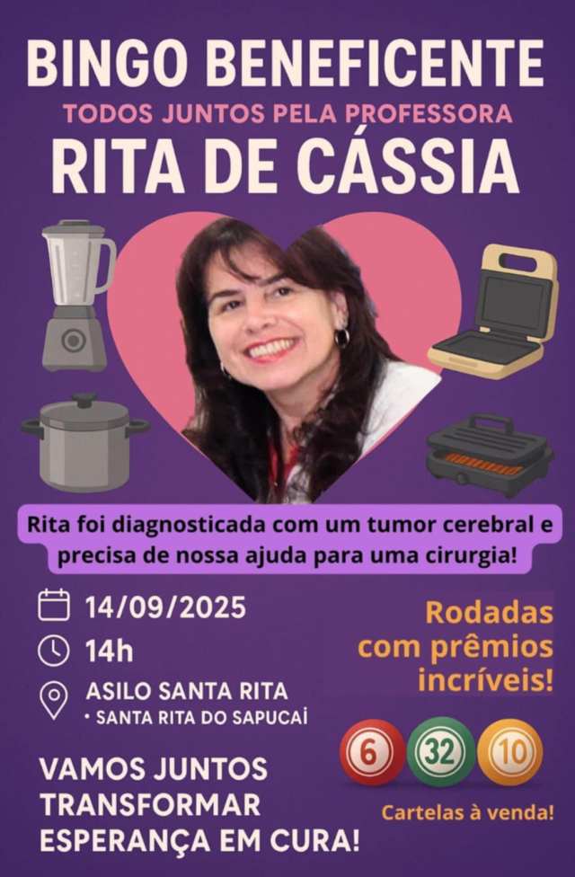 👩🏫 Nossa querida professora Rita de Cássia está enfrentando uma batalha delicada contra um tumor cerebral e precisa urgentemente de uma cirurgia. Para apoiá-la nessa jornada, estamos organizando um BINGO ESPECIAL cheio de prêmios incríveis e muita solidariedade! 💖