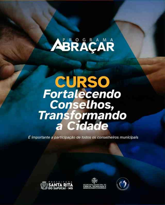 A Prefeitura Municipal de Santa Rita do Sapucaí, por meio do Programa Abraçar, convida todos os Conselheiros Municipais para um encontro especial do curso de orientação, ministrado pelo professor Magno Magalhães Pinto, referência em capacitação de conselhos.