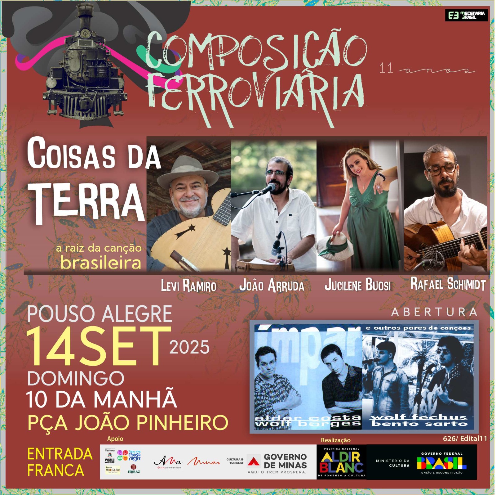 No dia 14 de setembro, às 10h da manhã, o coreto da Praça João Pinheiro, no coração de Pouso Alegre, recebe o espetáculo “Coisas da Terra”, dentro da programação do consagrado projeto Composição Ferroviária.