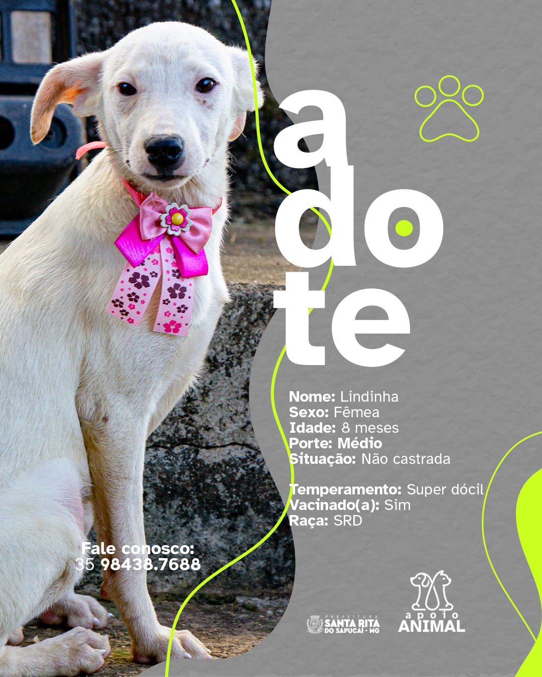 Fêmea, 8 meses, porte médio, SRD, vacinada e super dócil (ainda não castrada).