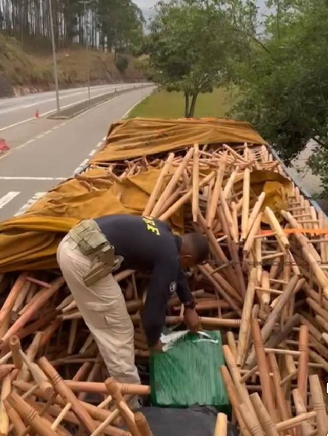 A Polícia Rodoviária Federal apreendeu, neste sábado (18/10), aproximadamente 5,4 toneladas de maconha escondidas sob uma carga de banquetas de madeira em um caminhão abordado no km 758 da BR-381, em Três Corações (MG).