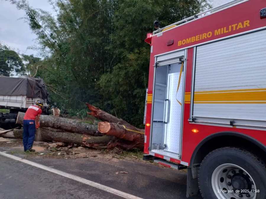 Carreta colide com árvore e causa interdição parcial da MGC-491 em Muzambinho