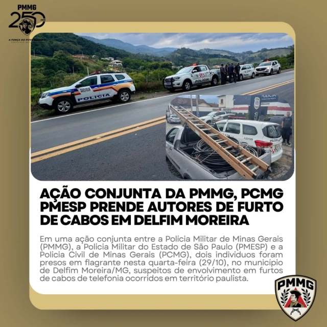 Em uma ação conjunta entre a Polícia Militar de Minas Gerais (PMMG), a Polícia Militar do Estado de São Paulo (PMESP) e a Polícia Civil de Minas Gerais (PCMG), dois indivíduos foram presos em flagrante nesta quarta-feira (29/10), no município de Delfim Moreira, suspeitos de envolvimento em furtos de cabos de telefonia ocorridos em território paulista.