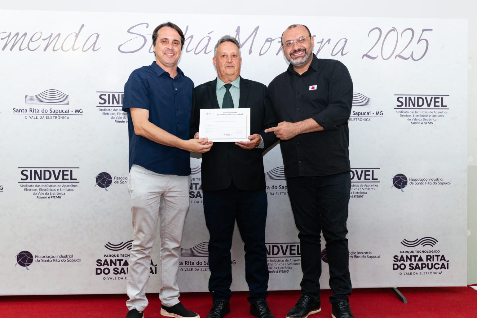 Durante a cerimônia, o presidente do SINDVEL, Roberto de Souza Pinto, e o prefeito, Leandro Henrique Mendes, receberam do subsecretário estadual de Liberdade Econômica e Empreendedorismo, Rodrigo Sampaio Melo, a renovação da certificação do APL (Arranjo Produtivo Local) de Santa Rita do Sapucaí. O APL permanece no nível 4 – Pleno, o mais elevado da categoria.