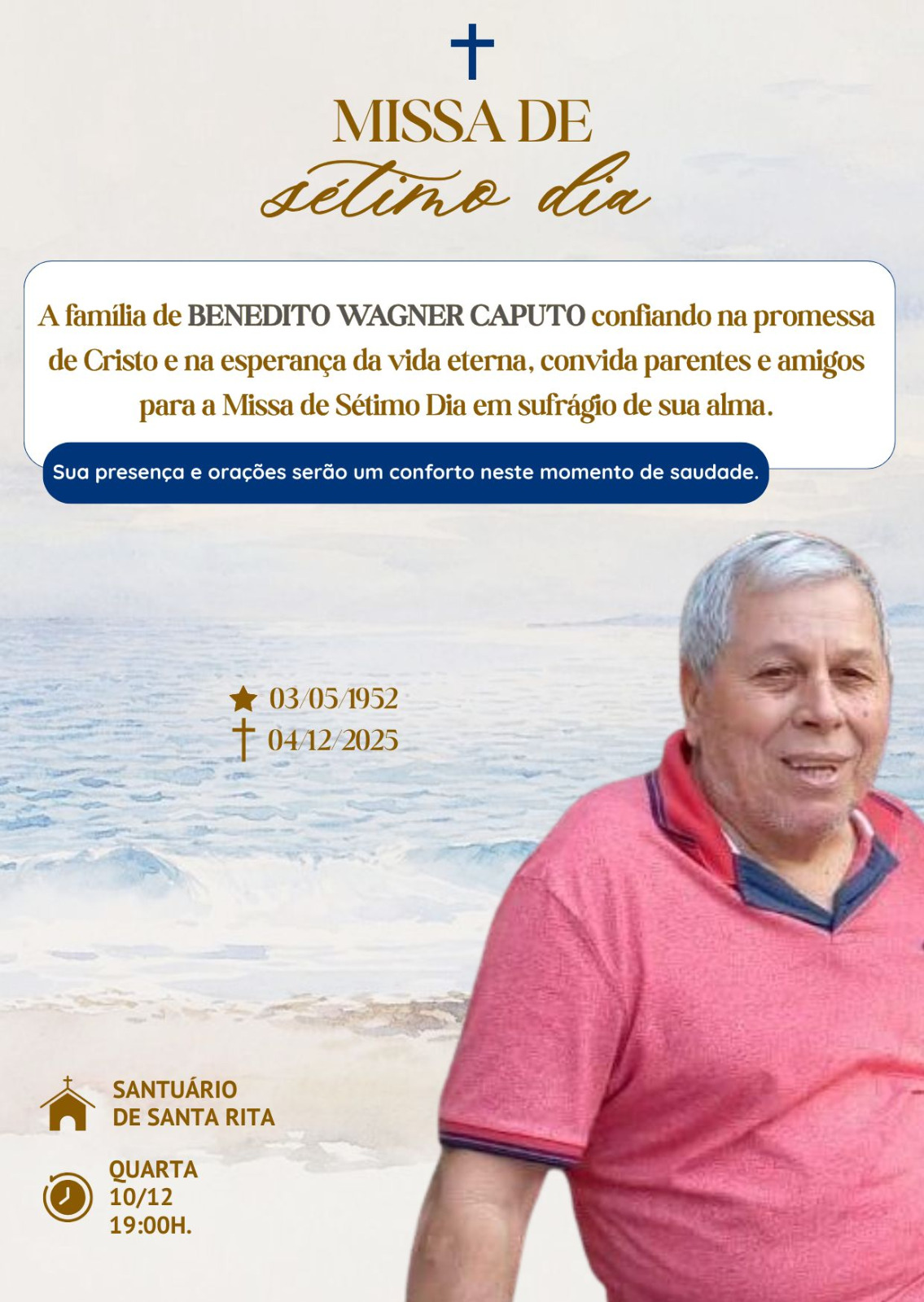 A família enlutada de Benedito Wagner Caputo, agradece a todos pelo apoio e conforto na ocasião de seu falecimento e convida para a Missa de Sétimo Dia pelo eterno descanso da sua alma.