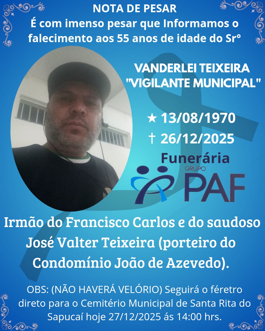 Comunicamos com pesar o falecimento de Vanderlei Teixeira (vigilante municipal), aos 55 anos.