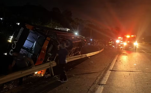 Um motorista ficou ferido após o tombamento de um ônibus na noite deste sábado (3), por volta das 22h40, na rodovia Fernão Dias, próximo ao km 858, em Pouso Alegre. No momento do acidente, o veículo transportava 39 passageiros e dois motoristas, totalizando 41 pessoas.