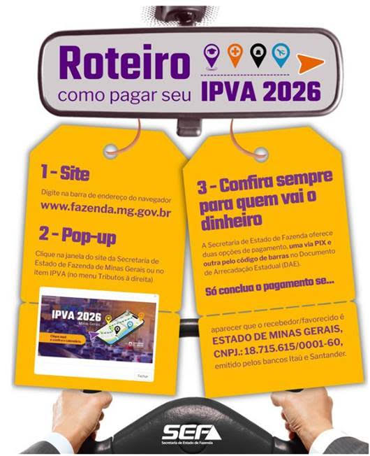 Proprietários de veículos devem ficar atentos e conferir a escala de pagamentos do Imposto sobre a Propriedade de Veículos Automotores (IPVA) de 2026 em Minas Gerais, que começa na próxima segunda-feira (9/2). De acordo com o final da placa, as datas de vencimento da primeira parcela ou cota única vão até o dia 13/2.
