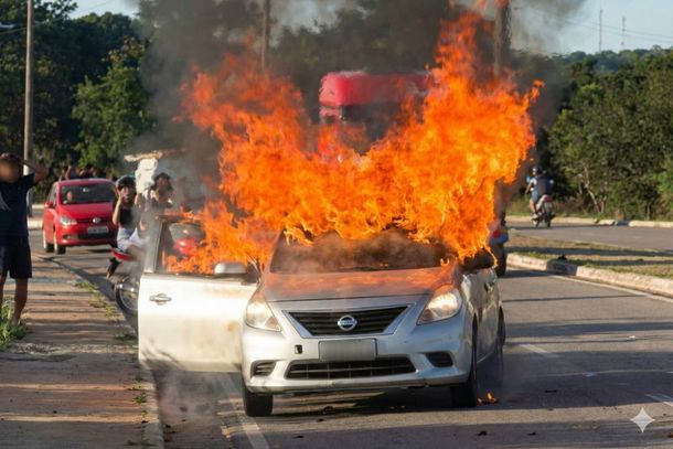 Quando os militares chegaram, o motorista já havia saído do carro — um Nissan Versa prata — e estava consciente. Ele apresentava queimaduras de primeiro e segundo grau nos braços. Após receber os primeiros cuidados no local, foi encaminhado ao Complexo Hospitalar Samuel Líbano, onde permanece sob observação médica.