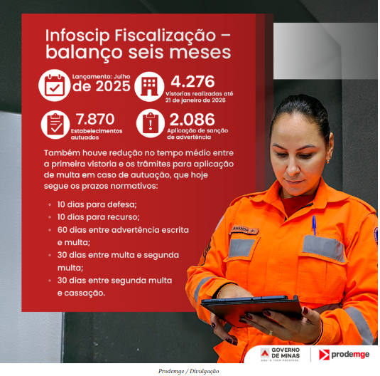 Após os seis primeiros meses de funcionamento do Infoscip Fiscalização – versão do sistema de fiscalização de edificações contra incêndio e pânico do CBMMG atualizado pela Companhia de Tecnologia da Informação de Minas Gerais (Prodemge) -, houve avanços como redução significativa no prazo de resposta entre pedido de vistoria e a concessão do Auto de Vistoria do Corpo de Bombeiros (AVCB) ou encaminhamento para adoção de medidas de regularização.