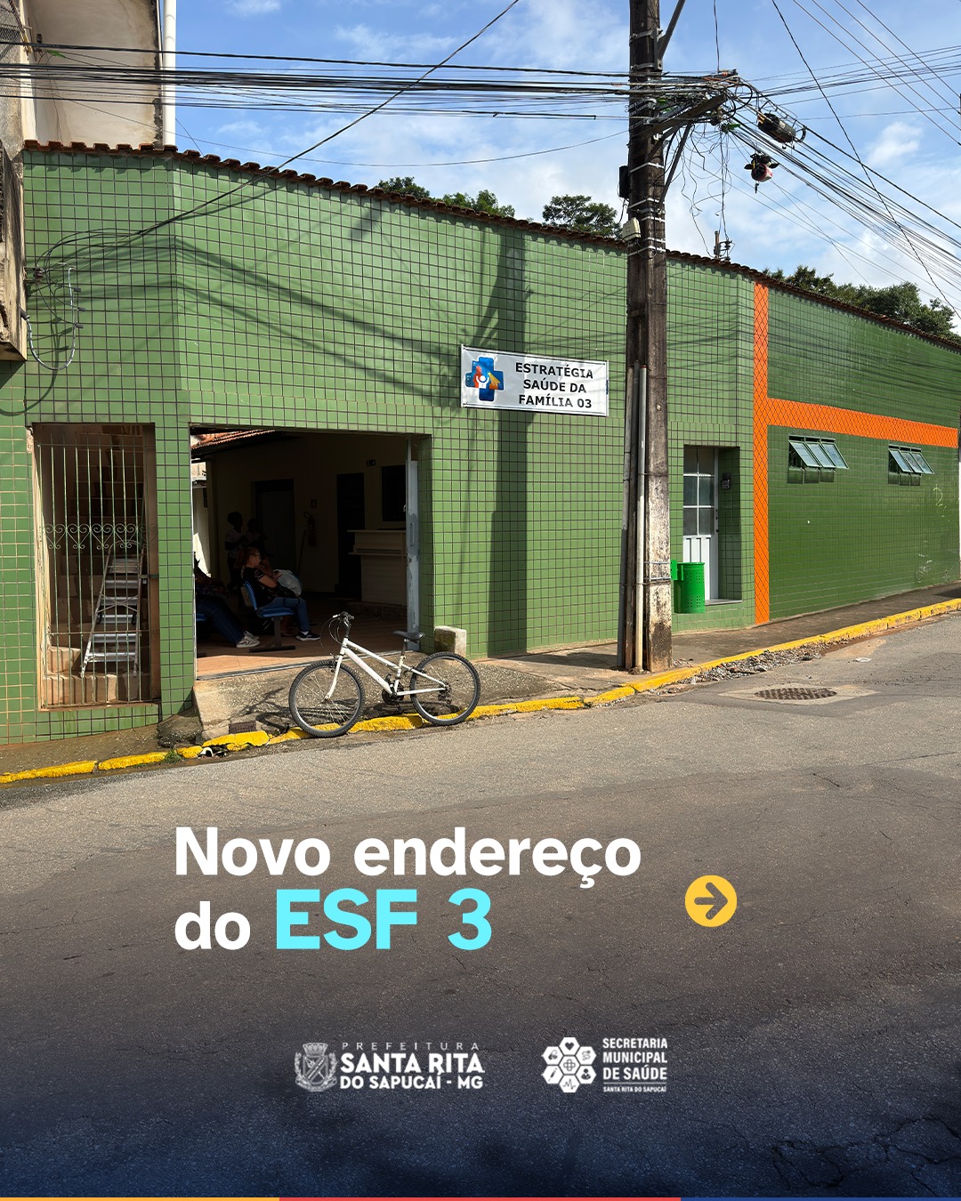 A Prefeitura Municipal de Santa Rita do Sapucaí informa que o ESF 3 – Estratégia Saúde da Família está atendendo em novo endereço para melhor acolher a população.