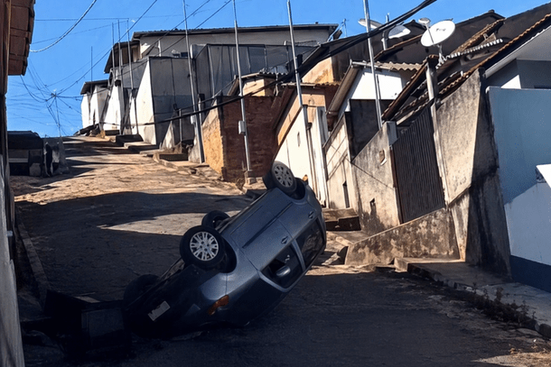 As imagens mostram um Fiat Uno capotando duas vezes após uma roda entrar em um buraco. Em seguida, o veículo desce a rua até despencar no fim da via. O motorista ficou preso dentro do carro e precisou ser retirado pelos bombeiros.